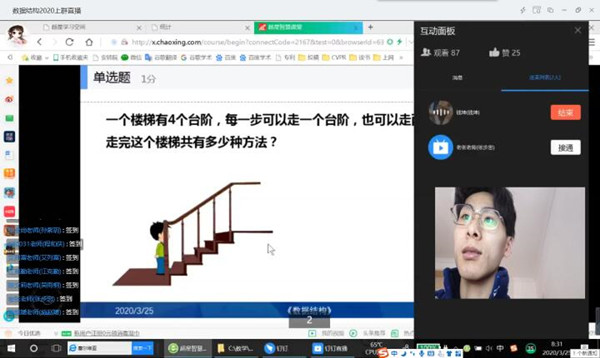 课前,郑馨老师将视频、ppt等学习资料上传至超星学习通,让学生做好课前预习工作,提前进入学习状态。在线课堂上,郑馨老师将钉钉直播和学习通在线教学平台有机结合。首先,通过汉诺塔游戏作为课程案例导入,激发学生的学习兴趣;接着,通过大量的视频动画由浅入深带大家逐步了解递归模型和递归调用过程;最后,再回归到案例导入,通过建立递归模型到编写递归算法,最终解决了案例导入中提出的问题。在教学活动中,郑馨老师熟练使用超星学习通的主题讨论、词云、测验、抢答和分组任务,以及钉钉直播的桌面共享、连麦等功能,充分调动了学生学习的积极性。课后通过超星学习通发布了限时课后作业,增强了学生对课程内容的掌握,并进一步提升了实际应用能力。