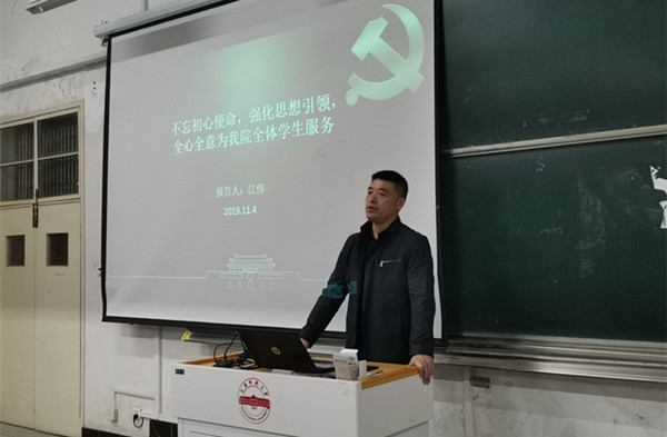 报告中,江伟结合学院发展历史和现状,从新时代我国教育发展的新理念、新思想、新观点、学校的发展现状以及如何把师资队伍建设放到更加突出的位置、把思想政治工作作为立德树人的铸魂工程、全面加强党的领导和党的建设等方面,讲授了一堂生动务实、内容丰富的专题党课。江伟提出要增强开展主题教育的责任感和使命感,强调这是推进新时代党的建设的迫切需要,实现党的十九大确定的目标任务的迫切需要。他鼓励学生党员要以民族复兴为己任,加强平时的理论学习和社会实践,发挥党员先锋模范作用。