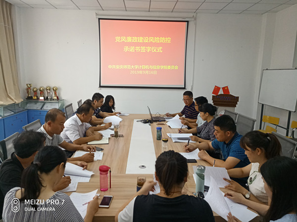 9月16日下午,计算机信息学院“三个以案”警示教育之风险防控自查与承诺活动在稼先楼一楼会议室进行,学院党政班子成员、全体科级干部、各支部书记、全体辅导员以及行政办公人员集体签订了风险防控承诺书。