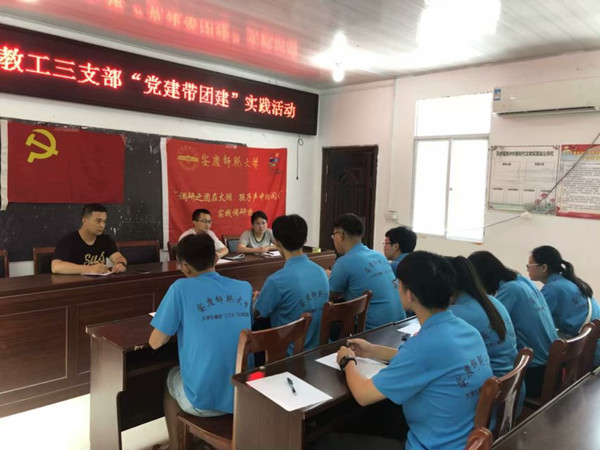 教工第三党支部组织大学生志愿者团队前往太湖县西冲村开展“不忘初心跟党走 牢记使命勇担当”主题“党建带团建”暑期社会实践活动。