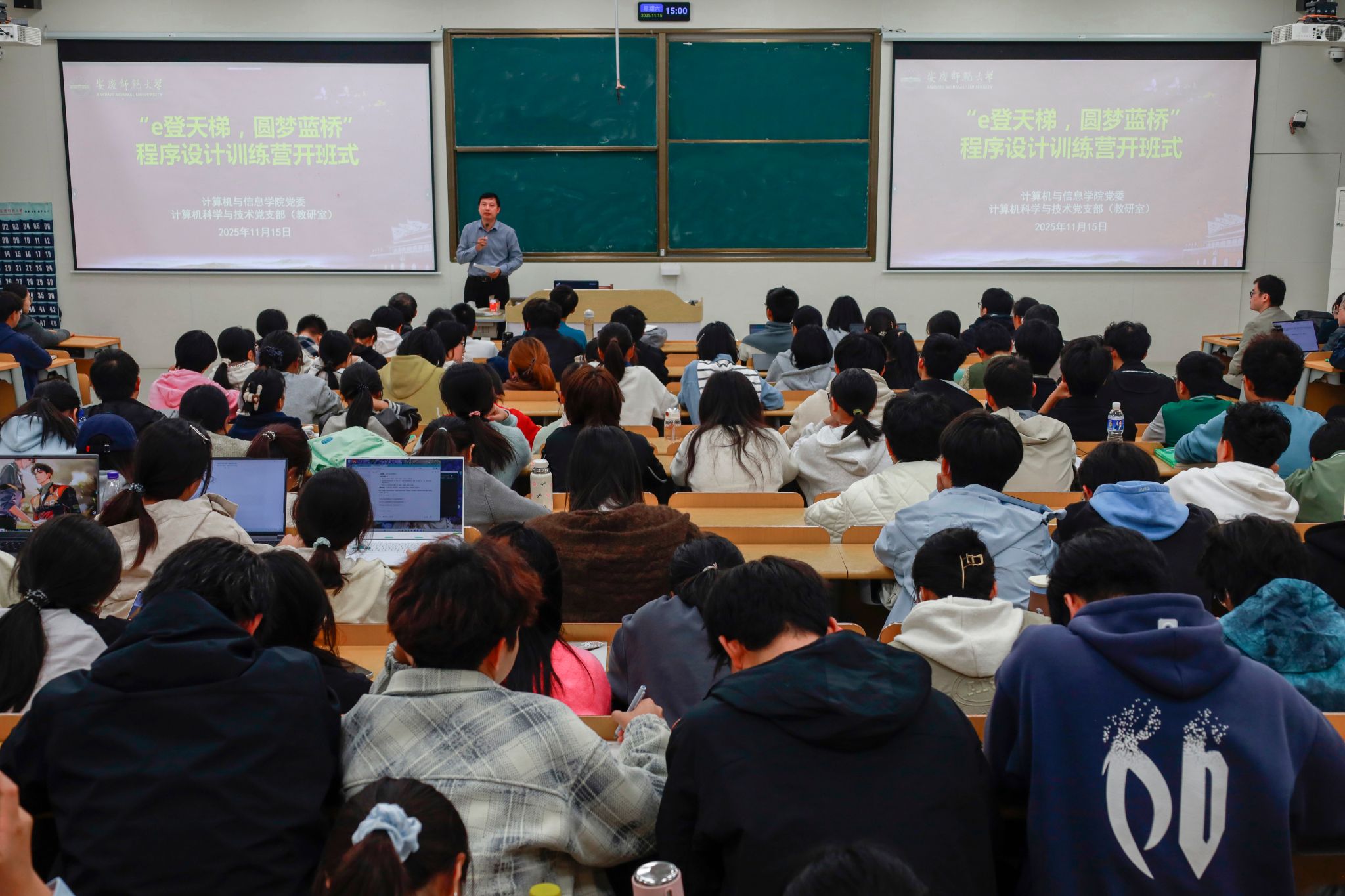 11月15日学院C108教室举行“e登梯,圆梦蓝桥”程序设计训练营开班仪式。学院党委副书记肖之进,党委委员、计算机科学与技术党支部书记、教研室主任江克勤,教师代表及参训学员等150余人参加活动