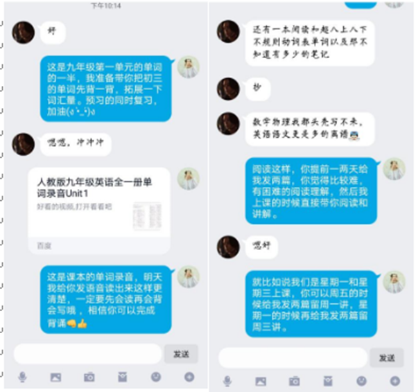 “e行动爱心助学服务队”的赵琦和陈晓彤等同学进行了线上授课,其中被教授的王同学是安庆市石化一中的一名准初三生,是毛巾哥