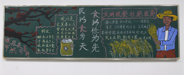 本次大赛分为教室设计和寝室设计两大部分,本次教室设计以“文明就餐,拒绝浪费”为主题,2020级各班级不仅将责任晚自习教室打扫的一尘不染,而且以“文字+绘画”的形式诠释对主题的理解。装满粮食的竹篓、怀抱粮食的农民、开心就餐的学生……一幅幅表达节约粮食、文明就餐的字画被刻印在文渊楼三楼和四楼各教室的黑板上。2020级计算机类3班引用了诗句“历览前贤国与家,成由勤俭败由奢”,深刻表达了勤俭节约对于一个国家、一个民族乃至个人的重要性。在评委走进教室的前一刻,2020级计算机类2班的李绍宇才刚完成黑板报的最后一笔。“比赛前觉得作品色彩还不够明亮,所以和同学一起过来赶工,希望能把它做得更完美。”李绍宇解释道,在他们的作品中,“光盘行动,文明就餐”八个大字被放置在板报的中央,背景是两个色彩鲜明的捧着光盘的卡通人物,未干透的颜料画让整个作品看起来更加鲜活生动。