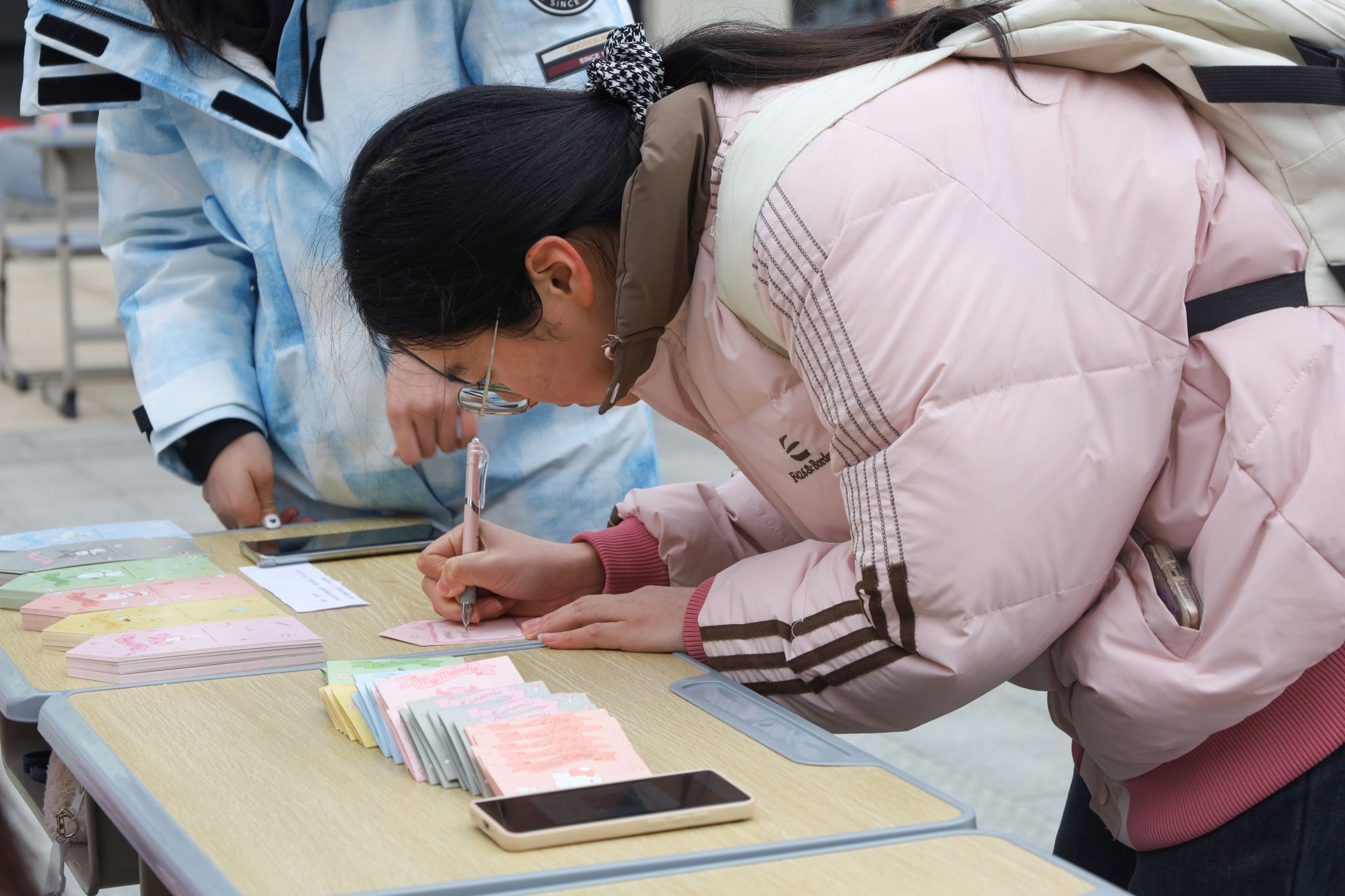 一笔一划,横撇竖直,一方贺卡承载着女生们对彼此的祝福和鼓励。来到“祝福交换驿站”,女生们抽取一张写过祝语的贺卡,并留下自己对其他女生的祝福贺卡,等待下一个“有缘人”。“我拿到的贺卡上写着抽中的人将成为最幸运的人!” 物理学专业2023(3)班的胡思颖抽到了“幸运卡”,她笑称,比起常规的祝福语,这种更像是游戏的技能卡,很有创意。“我留下了‘高分卡’,希望抽中的女生都能在考试中取得好成绩。”她说。