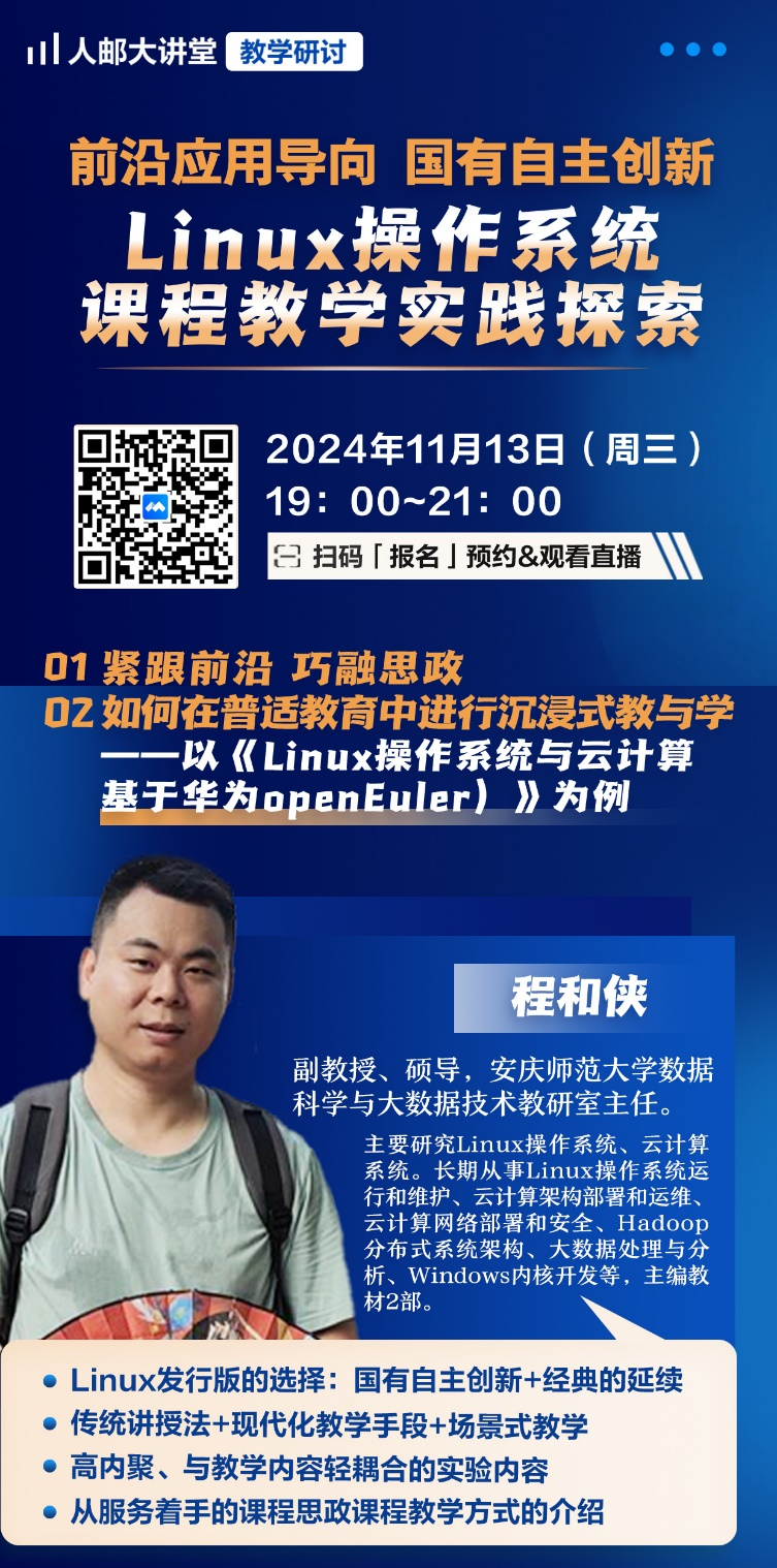 程和侠老师应邀参加人邮大讲堂线上教学研讨会。此次研讨会主题是“前沿应用导向 国有自主创新——Linux操作系统课程教学实践探索”,程和侠老师在会上做题为“如何在普适教育中进行沉浸式教与学——以《Linux操作系统与云计算(基于华为openEuler)》为例”的报告。