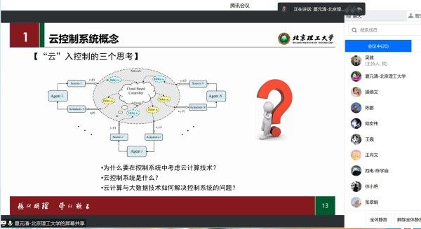夏元清教授分别就云控制系统的产生背景、关键科学问题、最新研究进展及所面临的挑战等方面作了介绍。他指出,传统的控制技术难以满足高品质和实时控制的要求,为此,云控制系统(Cloud Control Systems,CCSs)的概念被创造性地提出,控制的实时性因为云计算的引入得到了保证。通过各种传感器感知汇聚而成的海量数据储存在云端,在云端利用人工智能等智能算法,实现系统的在线辨识与建模,结合模型预测控制、数据驱动控制、云网边端协同控制等先进控制方法实现系统的自主智能控制。报告会后,毛巾哥