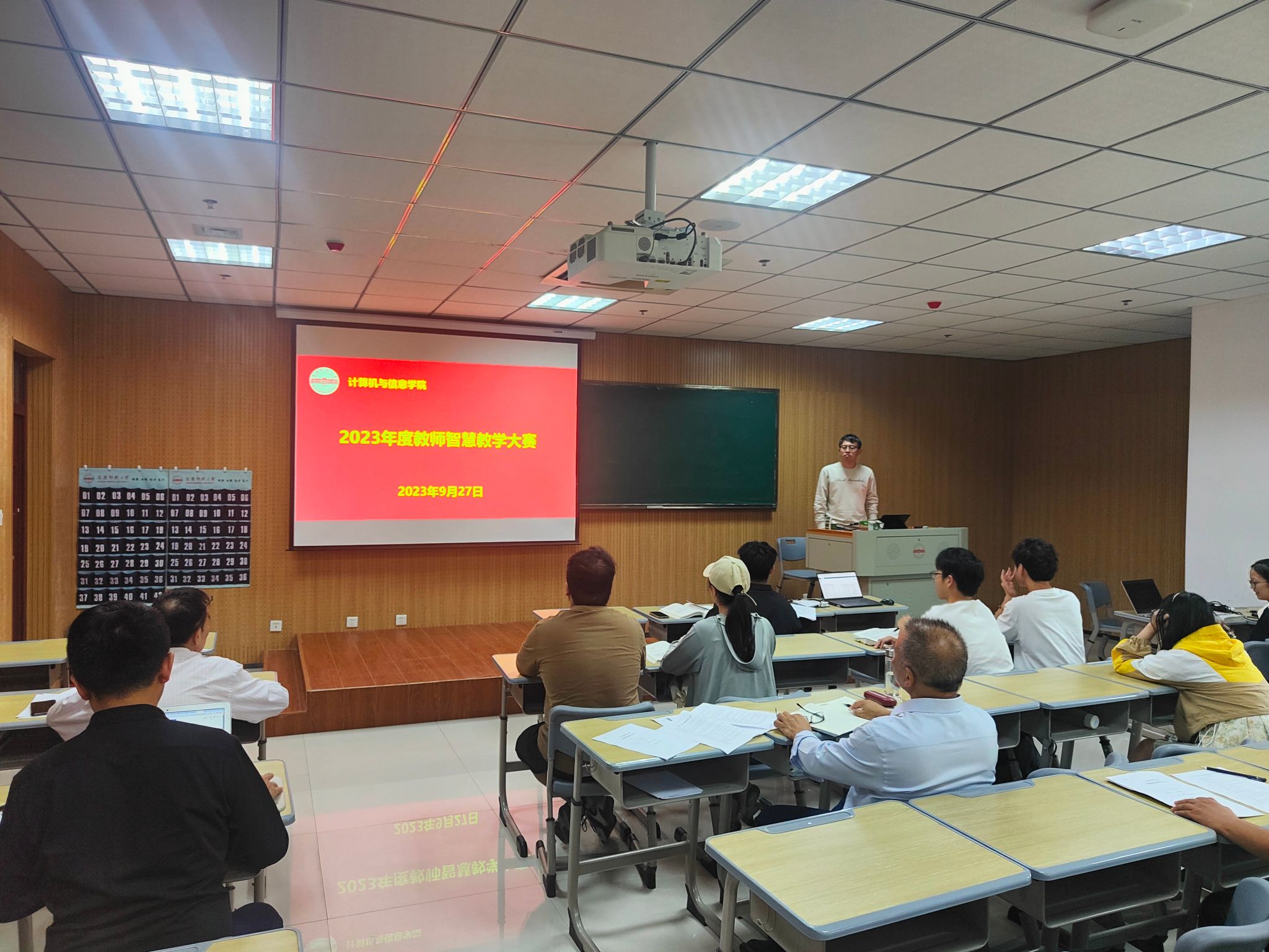 在龙山校区L102举行了2023年度教师智慧教学大赛。本次大赛由副院长吴海峰主持,邀请钱萌、王一宾、江克勤、蔡庆华等四位专家担任评委,多位学生旁听。