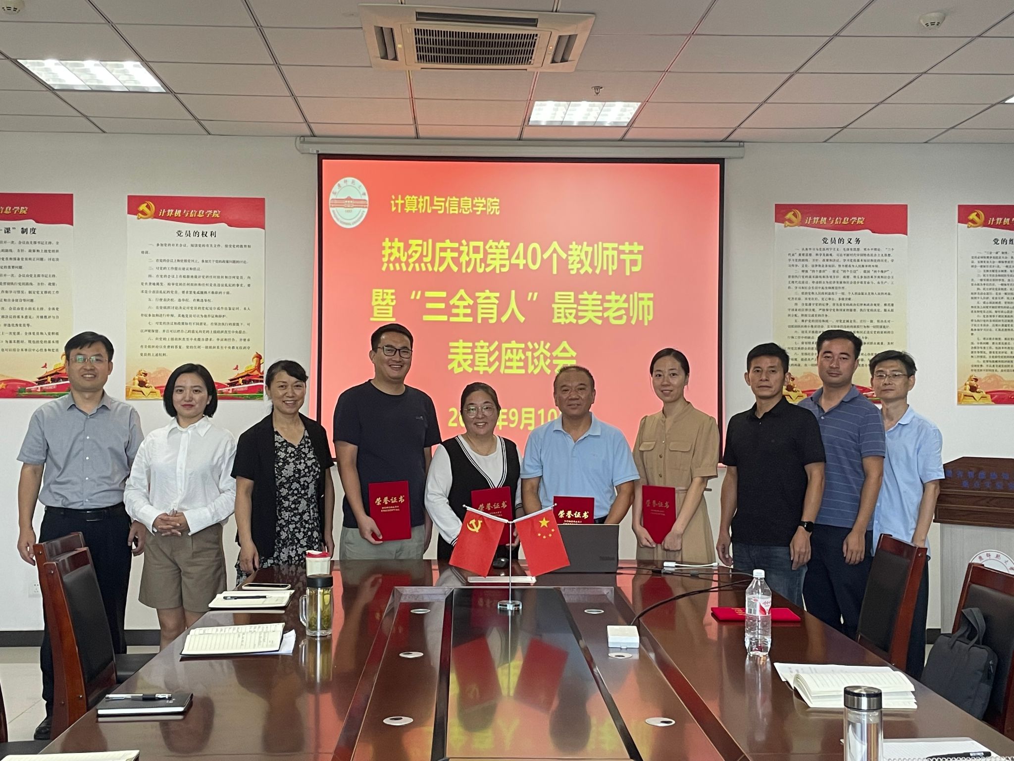 在L楼318教室召开 “三全育人”最美老师表彰座谈会,对过去一年中学院表现突出的优秀教师进行表彰,并号召学院新进教工及全体教师向受表彰的老师学习。学院领导班子成员、受表彰教师以及新进教职工参加座谈会。党委书记陈银凤主持座谈会。