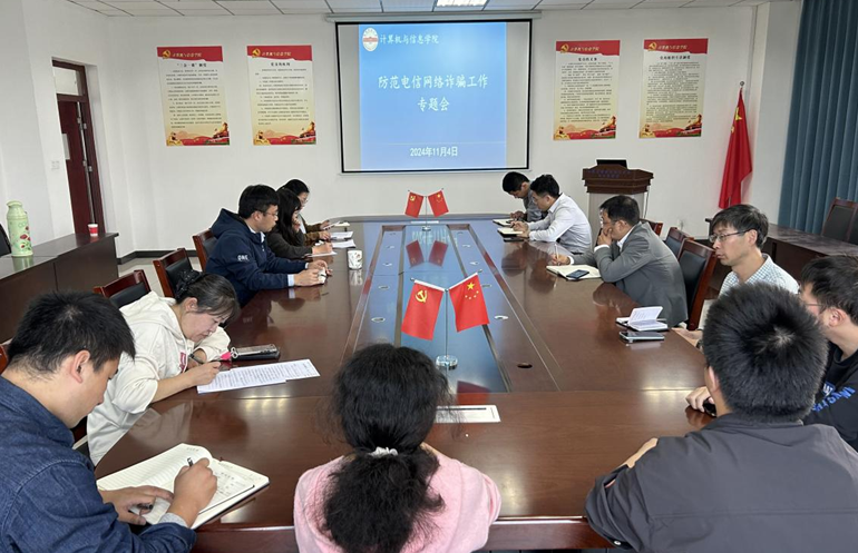 会议传达了学校近期召开的防范电信网络诈骗工作专题会议精神,并对学院防范电信网络诈骗工作进行了部署安排。会议通报了当前校园防范电信诈骗工作面临的形势,分析了毛巾哥