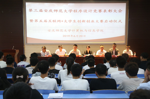 程序设计竞赛表彰大会暨第五届“互联网+”大学生创新创业大赛启动仪式。该院领导班子、指导老师和学生以及程序设计大赛的实践单位代表共100余人参加了大会。会议由该院副院长刘奎主持。