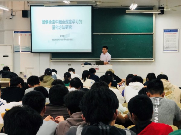艾列富从实际的图像搜索引擎入手,就如何实现图像大数据的快速检索问题,介绍了其工作原理和需要使用的相关技术,阐述了对图像内容进行编码的意义和重要性。结合个人及其研究团队的研究方向,围绕基于量化的图像检索,重点总结和分享了面向检索的量化模型和检索方法以及将量化模型同深度学习网络相结合形成端到端的学习模型等方面研究进展和成果。报告结束后,艾列富副教授同现场学生进行了充分的交流,就学生感兴趣的问题进行了解答。